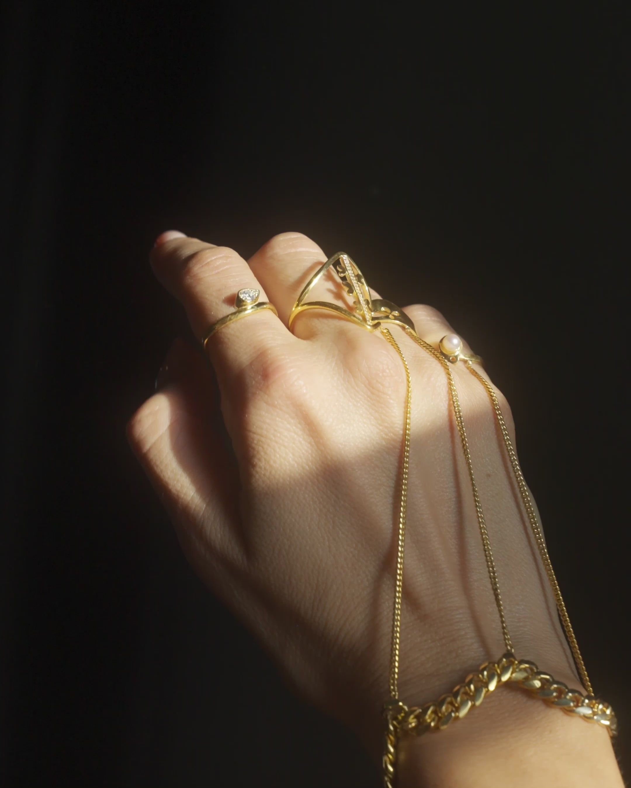 Featuring three intricately designed rings linked by a delicate chain bracelet, along with a separate ring for the index finger, this design is crafted in your choice of 18K yellow or white gold.